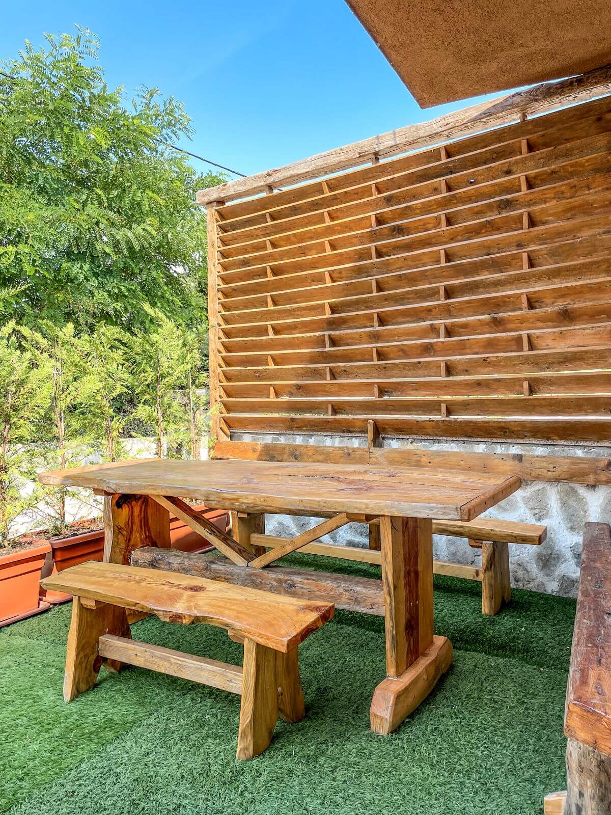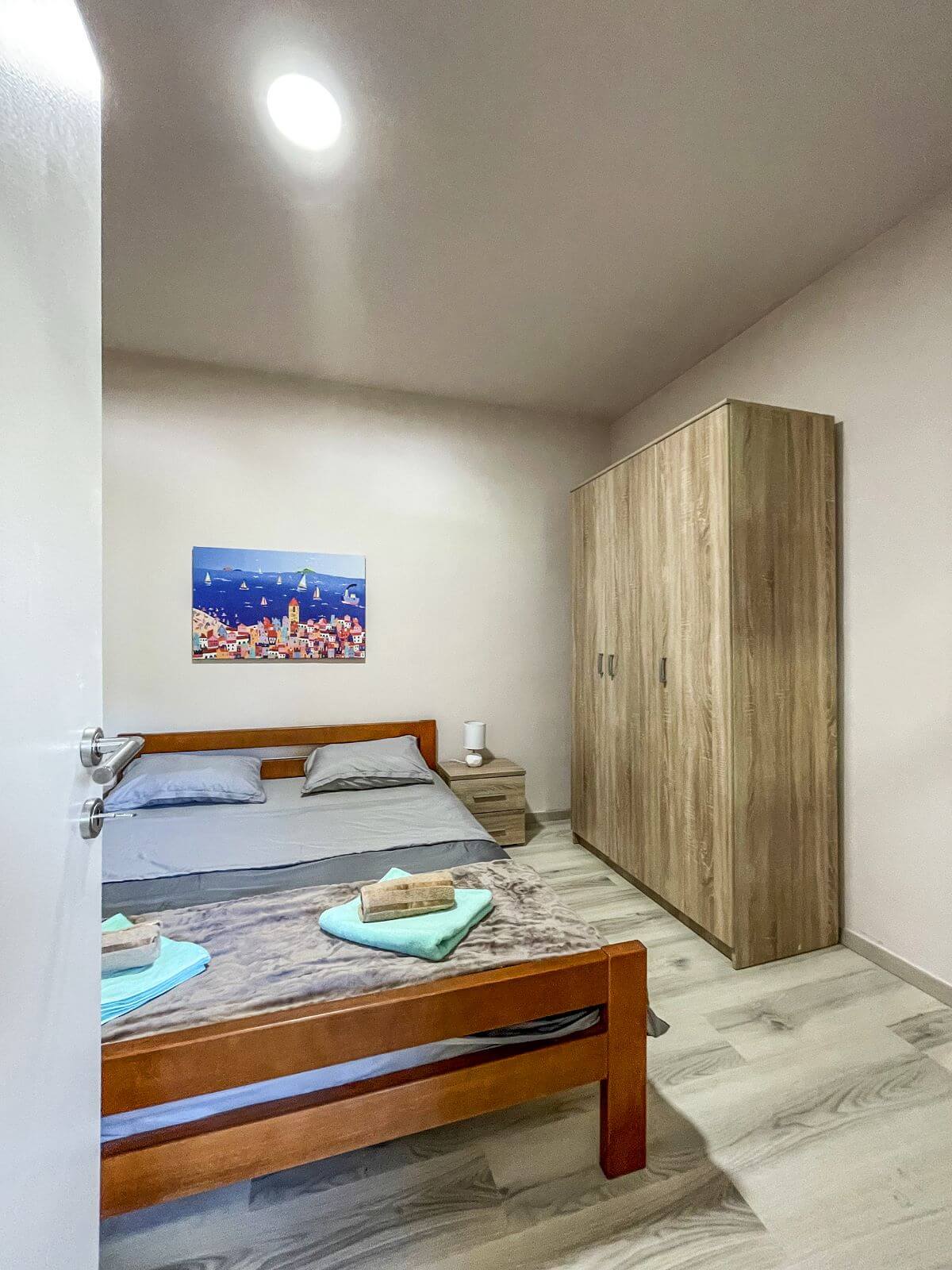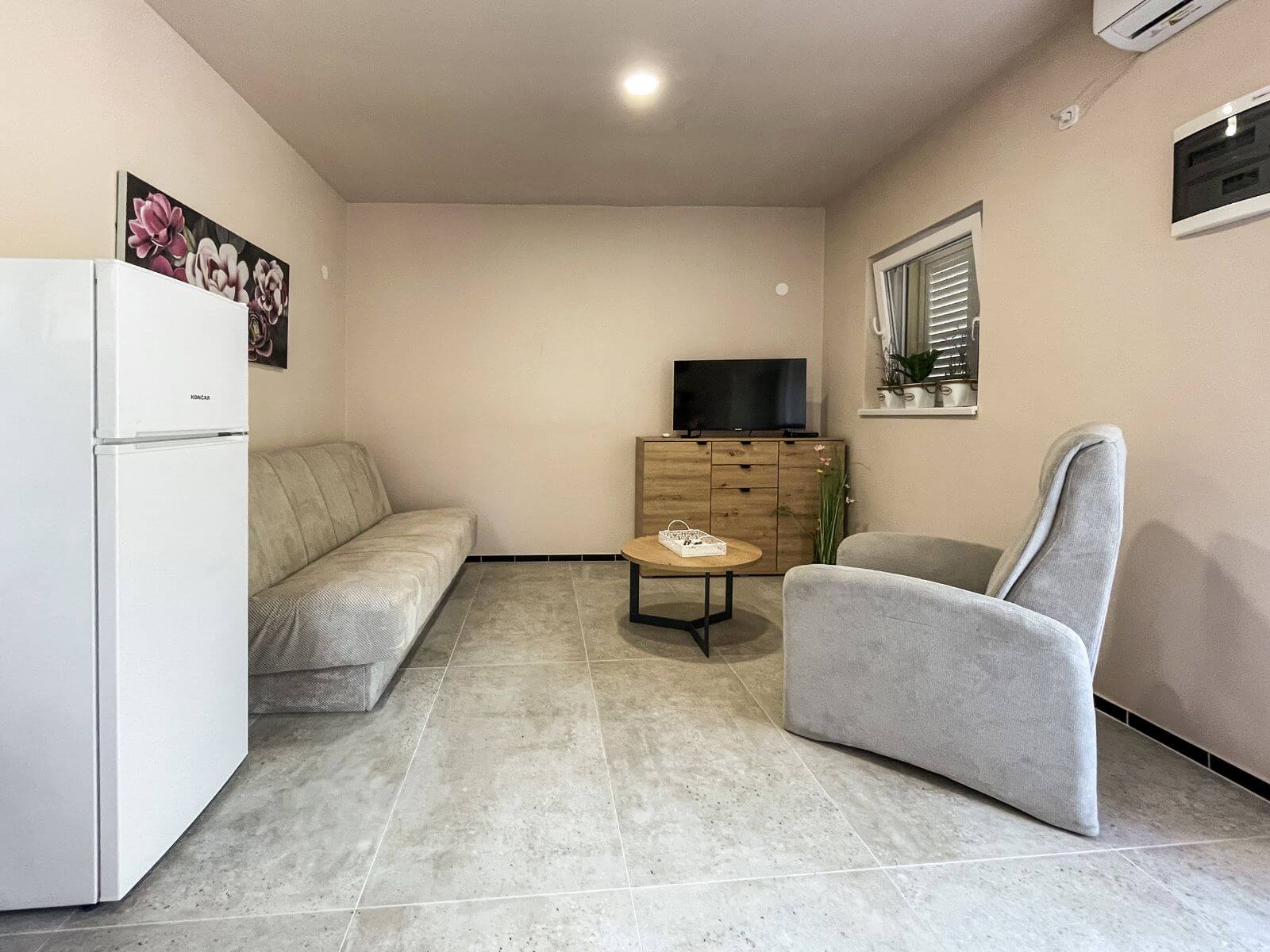 Uživajte u privatnosti sobe s bračnim krevetom, dok dodatni pomoćni ležaj u dnevnom boravku pruža fleksibilnost smještaja. Kupatilo je moderno opremljeno, a terasa je savršeno mjesto za opuštanje.