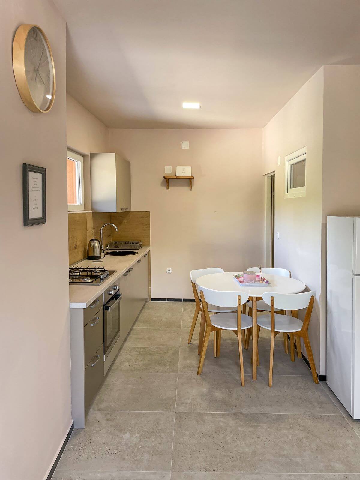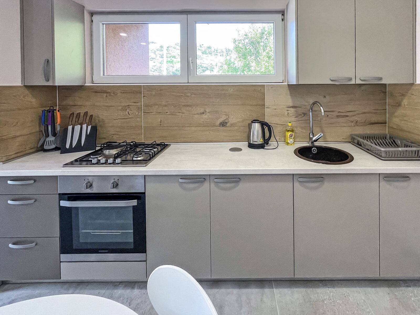 Dobrodošli u Apartman Nikola – prostor gdje udobnost susreće praktičnost. Prostrana kuhinja spojena s dnevnim boravkom stvara ugodan ambijent za druženje, a kvalitetno opremljena kuhinja omogućava pripremu ukusnih obroka.
